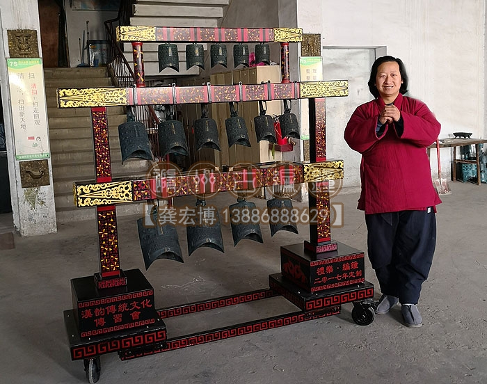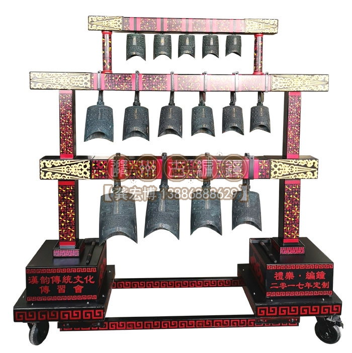 合肥漢韻文化傳習(xí)會(huì)定制的15件3層編鐘長1.9米、高1.86米、寬0.5米,音律齊全,演奏使用方便,木架上可以彩繪客戶定制文字或圖案,底部安裝鋼制滑輪,安裝移動(dòng)都非常方便,配有樂器標(biāo)準(zhǔn)航空箱,外出表演得心應(yīng)手。